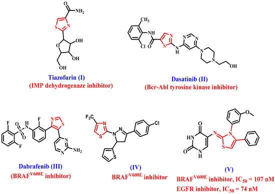 Thiazole and its derivatives are also among the most active chemicals, ranking first in anticancer activity [27,28,29]. As well, thiazole-containing molecules were identified in a number of therapeutically available anticancer medicines (Figure 1), including tiazofurin (I) [30], dasatinib (II) [31,32], and dabrafenib (III) [33,34].