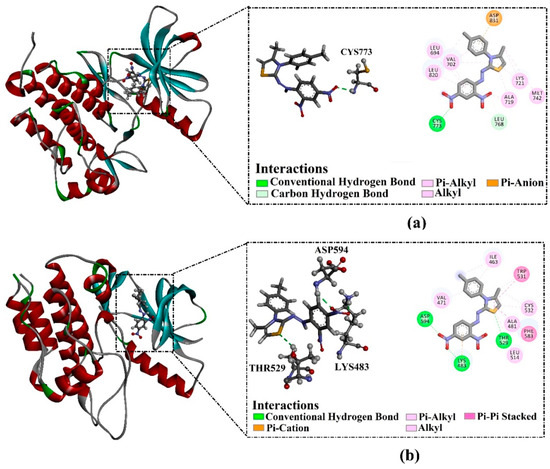 Compound 3a exposed the third-lowest docking score, with values of −8.4 and −8.0 kcal/mol against BRAFV600E and EGFR, respectively (Table 5). Compound 3a made one H-bond with the CYS773 (2.21 Å) of EGFR, while compound 3a exhibited three H-bonds with the LYS483 (2.15 Å), THR529 (2.38 Å), and ASP594 (2.12 Å) within the BRAFV600E binding pocket.