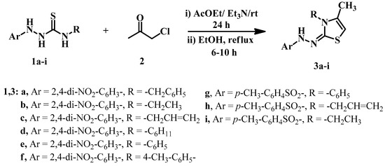 In a 50 mL round-bottom flask containing 20 mL absolute ethanol, a molar ratio (1:1) mixture of chloroacetone and substituted thiosemicarbazides 1a–i was added. The flask was fitted with a condenser and was refluxed for 6–10 h. The reaction was monitored with TLC to assure the reaction completion. Then, the reaction mixture was cooled to room temperature, and the formed precipitate was filtered off and recrystallized from ethanol to afford products 3a–i.