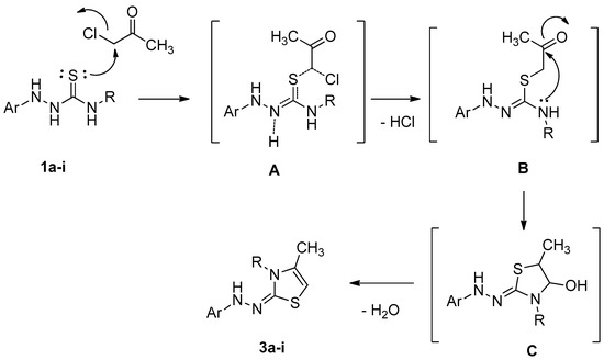 The hypothesized mechanism for the synthesis of thiazole compounds 3a–i.