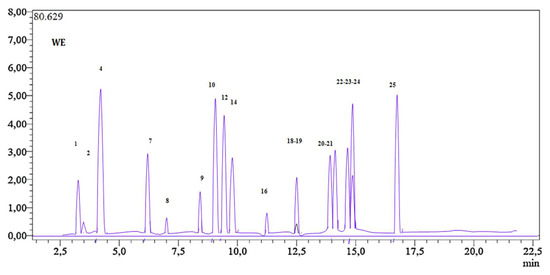 To ensure the reliability of the LC–MS/MS method, comprehensive method validation parameters were determined. The analytical characteristics of reference compounds, including linearity ranges and rectilinear regression estimates, were previously documented in the literature [53]. All calibration curves for the studied compounds exhibited linearity and reproducibility, with correlation coefficients exceeding 0.991. Additionally, the limit of detection (LOD) and limit of quantitation (LOQ) for the analyzed compounds were reported by Ertas and Yener [53]. LOD values ranged from 0.05 to 25.8 g/L, while LOQ values ranged from 0.17 to 85.9 g/L. Moreover, the recovery percentages of phenolic compounds ranged from 96.9% to 106.2%.