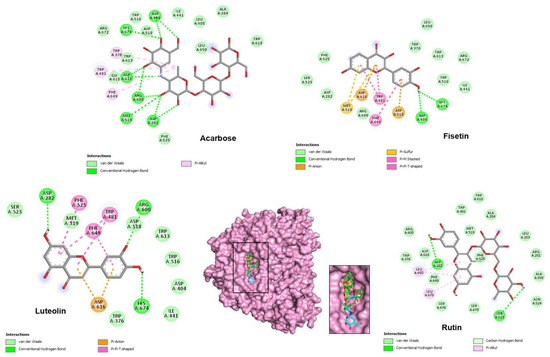 Two-dimensional predicted binding mode for acarbose and the best top phenolic ligands of H. albus with α-glucosidase (5NN8). In the center, a 3D view of the binding gorge with an expanded picture at the active site showing acarbose, fisetin, luteolin, and rutin as cyan, yellow, orange, and green sticks, respectively, bound to the surface of α-glucosidase.