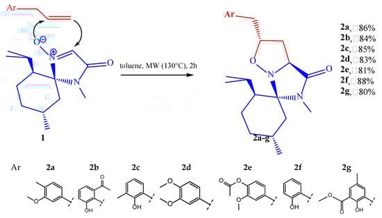 - Singh, R.; Bhella, S.S.; Sexana, A.K.; Shanmugavel, M.; Faruk, A.; Ishar, M.P.S. Investigations of regio- and stereoselectivities in the synthesis of cytotoxic isoxazolidines through 1,3-dipolar cycloadditions of nitrones to dipolarophiles bearing an allylic oxygen. Tetrahedron 2007, 63, 2283–2291. [Google Scholar] [CrossRef]