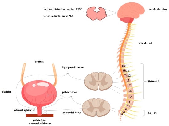 The most important function of the kidneys and urinary tract is the excretion of urine containing metabolic wastes and drugs with their metabolites, which is one of the vital functions of the human body. The voiding process is under the control of complex peripheral neural pathways that are, in turn, coordinated by cell groups in the spinal cord, brainstem and brain. There are two complementary stages: the storage of urine inside the bladder (“filling”) and (2) the elimination of urine through micturition, involving bladder emptying and urinary outlet (it consists of the bladder neck, the urethra and the urethral sphincters) []. The storage reflex maintaining continence is based on the bladder distention that enables bladder filling. The bladder normally accommodates up to 300–400 mL in adults. Moreover, the filling phase is characterised by the voluntary contraction of the external urethral sphincter, with the sympathetic contraction of the inner urethral sphincter [].