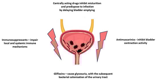 An uncomplicated urinary tract infection (UTI) is an infection of the lower urinary tract (urethra and bladder), developing in patients without structural abnormality and comorbidities, such as diabetes, immunocompromised state, pregnancy, kidney transplants, the presence of a urinary catheter or other factors predisposing them to a complicated course of the infection. It is commonly known as cystitis or lower UTI, and it manifests itself with typical symptoms including urinary frequency, urgency, suprapubic discomfort and dysuria. UTI is usually caused by enteric coliforms that typically inhabit the periurethral vaginal introitus, with Escherichia coli as the main etiological factor constituting the vast majority of UTIs, followed by Klebsiella, and other organisms (Proteus, Enterobacter, and Enterococcus). Uncomplicated UTI involves the bladder starting with the invasion of the bladder mucosal wall by bacteria using adhesins on their surface, which allow them to attach to the urothelial mucosal surface. In addition, a short urethra makes it easier for the uropathogen to invade the urinary tract; thus, UTIs are significantly more common in women. Estimates indicate that 40% to 60% of women will have a UTI episode at least once in their lives, which means that UTIs are observed four times more frequently in females than males. A UTI may also progress to further complications: increasing the risk of urinary calculi development, UI, chronic prostatitis and affecting the upper urinary tract (pyelonephritis, kidney abscess, kidney failure) [,]. The pathophysiology of infectious UTI is beyond the scope of this review and can be found in some papers in this field [,,]. However, UTI development may also result from the patient’s pharmacotherapy. Thus, urinary tract infections may be a urological manifestation of adverse drug reactions. One of the classes of drugs with the best-documented effect on the development of UTI are gliflozins (inhibitors of kidney sodium-glucose co-transporters SGLT2), which directly results from their mechanism of inhibiting the reabsorption of glucose from the urine. As a consequence, glycosuria occurs, which is the basis for the urogenic, ascending urinary and genital tract infections []. However, there are also other drugs that predispose to the development of UTIs. The other main mechanisms accounting for a drug-induced UTI include immunodeficiency in the lower urinary tract (as a result of systemically or topically acting immunosuppressive and cytotoxic drugs); the impairing of micturition and bladder emptying (due to the cholinolytic activity or the increasing of the bladder outlet resistance evoked by the drugs mentioned above); and impairment of the neurogenic control of the bladder. They are summarised in Figure 4.