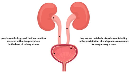 Taking into account the main pathomechanism, two main types of drug-induced urinary stones can be distinguished. They are shown in Figure 5.