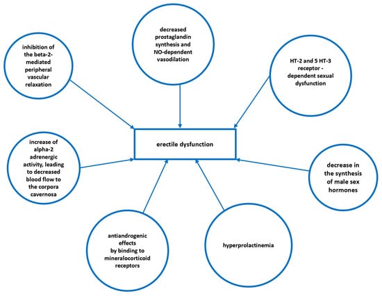 There are many causes of erectile dysfunction (ED) development in men, including pathophysiological (hypertension, hyperlipidemia, diabetes) and psychological factors. However, there are also iatrogenic causes of ED, including drugs. Several drug-dependent mechanisms can be implicated as potentially contributing to the ED development. Among them, there is an antiandrogenic effect, hyperprolactinemia development, a decrease in the level of androgens, disorders of autonomic innervation or impaired peripheral circulation. They are shown in Figure 6.