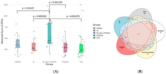 According to the Venn bacteria diagram, a total of 117 of 822 OTUs were shared by five groups (Figure 1). Therefore, these 117 OTUs constitute the core microbiota. While 81 OTUs were observed only in the healthy group, the numbers of OTUs observed only in the sick, probiotic, oil, and fat plus probiotic groups were 65, 46, 75, and 63, respectively.