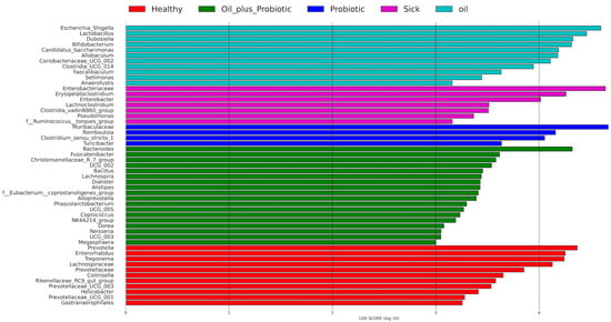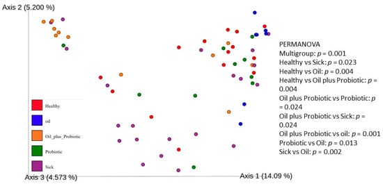 When beta diversity between samples is examined, a significantly different distribution is detected between the groups (Figure 2). These results show that the group that received the oil-probiotic mix protocol differed significantly from the other groups. Significant differences in beta diversity were observed among all groups (p = 0.001). Significant beta diversity was found between sick and healthy rats; between sick rats and rats that only took the oil mix protocol; and between healthy rats and rats that took the oil mix plus probiotic mix protocol (p values are 0.023, 0.002, and 0.004, respectively).