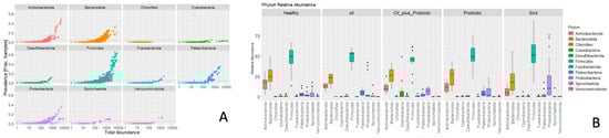 (A) The most common visible phyla. (B) Graph of relative abundance of groups at the phylum level.