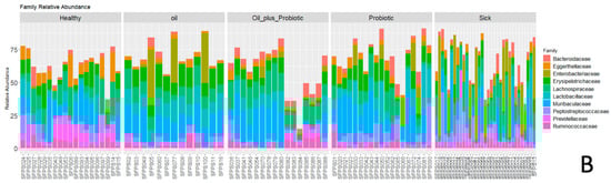 In contrast, the microbial diversity was reduced in the sick rats (Figure 1). According to the statistical comparison of Shannon from the alpha diversity index (Figure 1f), a statistically significant difference was found between healthy rats and rats treated with the probiotic mix plus oil mix protocol and between sick rats and rats treated with the probiotic mix plus oil mix protocol (respectively p value 0026, 0.0002). In the same index, a statistically significant difference was found between the rats to which only the probiotic mix protocol was applied and the rats to which the oil mix + probiotic mix protocol was applied, and between the rats to which only the oil mix protocol was applied and the rats to which the oil mix + probiotic mix protocol was applied (p values are 0.0016 and 0.014, respectively).