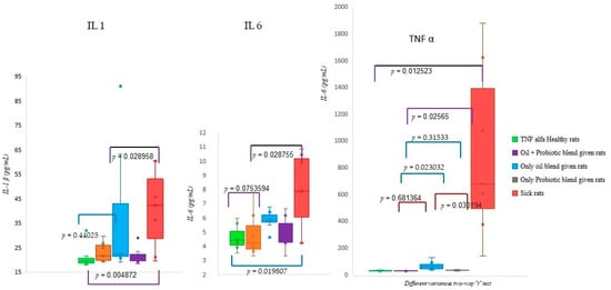 IL-1β, IL-6, and TNF-α results; the graph of difference was evaluated with t-tests for two-way differences. Healthy rats, n = 8; rats given oil mix plus probiotic mix, n = 7; rats given only oil mix, n = 8; rats given only Probiotic mix, n = 7; sick rats, n = 9.