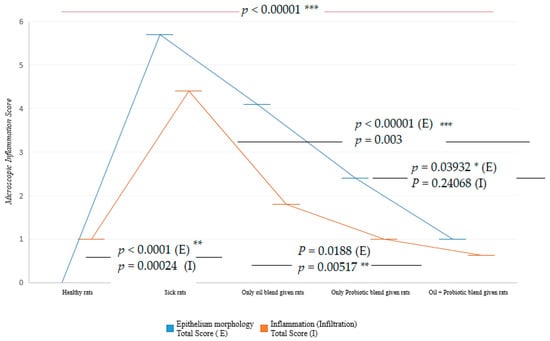 Epithelial structure and infiltration scoring were performed in the tissues examined histopathologically [17,18]. There was a significant difference between the rats that received only the oil mix protocol and the rats that received only the probiotic mix protocol and the rats that received only the oil mix protocol, and the rats that used the oil + probiotic mix protocol (p < 0.05). There was no significant difference (p = 0.241) in inflammation score between the rats that were administered only the probiotic mix protocol and the rats that were administered the oil plus probiotic mix protocol (Figure 7).