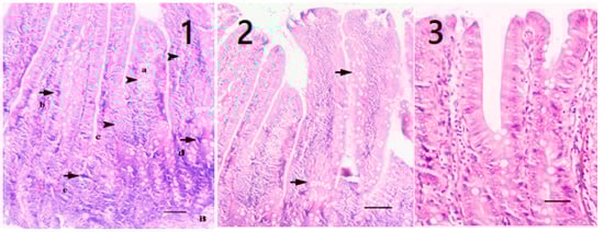 (1) Decreased inflammatory reaction; villi: numerous mitotic figures (arrowheads a–e) in their epithelium and crypts. Brunner’s glands (B). (2) elongated and hyperplastic in places in epithelial villi increase in goblet cells (arrows), Duodenum, HE, bar = 45 μm. (3) regenerated sometimes fused villi in the region of epithelium. There is no inflammatory reaction. Duodenum, HE, bar = 20 μm.