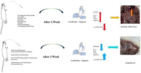 The healthy group was separated for the study, and a special nutritional diet was applied to the experimental groups to create dysbiosis in the large intestine and SIBO in the small intestine. Antibiotic agents that would shift the intestinal microbiota in one direction and a combination of chemical agents (polyacrylamide) and trans-fat-containing foods were given, and the microbiota of the large intestine was disrupted (dysbiosis). Dietary material containing amoxicillin, clavulanic acid, and macrolide (to impair motility activity for SIBO) was administered at approximately 200 mg/kg/day by gastric gavage (oral to stomach tube) for 4 weeks. Long-term use of antibiotics generally leads to dysbiosis. In particular, the “macrolide” group (clarithromycin) of antibiotics impairs motility and reverses the sweeping movement from the small intestine to the large intestine. Impaired gut motility leads to the migration of microorganisms from the large intestine microbiota to the small intestine, and therefore, by causing a more than expected increase in microorganisms in the small intestine, it has prepared the environment for SIBO [27]. To confirm SIBO formation and stimulate inflammation in rats, trans fat (100 mg/kg/day) was added to the diet, and 1 mL/day of 10% bicarbonate water was added to increase gastric pH, and a proton pump inhibitor of 3 mg/kg/day for 4 weeks was applied. Before each feeding, a physical examination of the rats was performed to observe significant bloating and gas. Rats with gastrointestinal swelling and increased gas were sacrificed, and histopathological groaning was performed. After the diagnosis of the disease was confirmed histologically, the sick rats were divided into different treatment groups, and the study continued (Figure 10). 10 rats were used for each group.