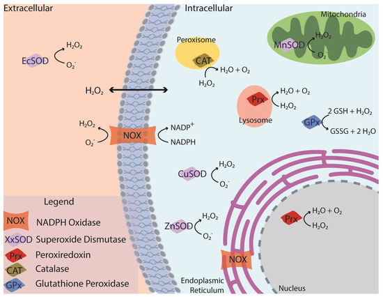 Glutathione, another key player in the antioxidant system, is predominantly reduced via glutathione peroxidase (GPX) in the cytosol and is retained within the cell, though GPX can be found in all cellular compartments. Similarly, specific forms of superoxide dismutase (SOD) are found in the extracellular space (EcSOD) while others can be found in the mitochondria (MnSOD) or the cytosol (ZnSOD, CuSOD). The different types of SOD use different transition metals as cofactors in the generation of H2O2 from oxygen radicals. The complexity and inter-connected nature of ROS generation has been well described in other reviews [38,39].