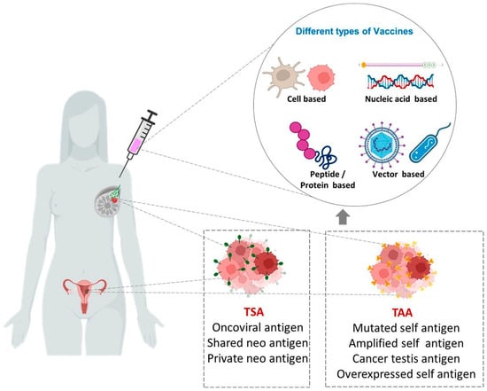 Cancer vaccines stimulate both cellular and humoral immune response by utilizing tumor-associated antigens (TAAs) and tumor-specific antigens (TSAs), thus preventing tumor growth and killing tumor cells [39]. Traditional vaccine preparations that target TAAs are having low immunogenic capacity and risk of toxicity to normal cells [40]. TSAs or neoantigens, on the other hand, are only expressed by cancer cells and elicit strong immune responses because of the lack of immunological tolerance [41]. TSAs are highly specific and are used in the production and design of personalized vaccines [40]. The possibilities of various approaches in cancer vaccines with potential against female-specific cancers are summarized in Figure 1.