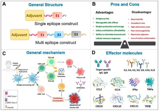 Peptide vaccines are composed of synthetic peptides which are highly immunogenic and elicit desired and specific adaptive immune response [46]. They come in a variety of forms, including multivalent long peptide vaccines, multi-peptide vaccines containing CTL and T helper-epitopes, peptide cocktail vaccines, hybrid peptide vaccines, personalized peptide vaccines, and peptide-pulsed dendritic cell vaccines [47]. The efficacy of peptide vaccines are widely studied against neurodegenerative diseases [48,49], infectious diseases [50] like human immunodeficiency virus (HIV) [51,52], hepatitis C virus [53], tuberculosis [54], foot and mouth disease [55], cancer [6], etc. The general aspects of peptide vaccines in the context of cancer therapy are summarized in Figure 2.