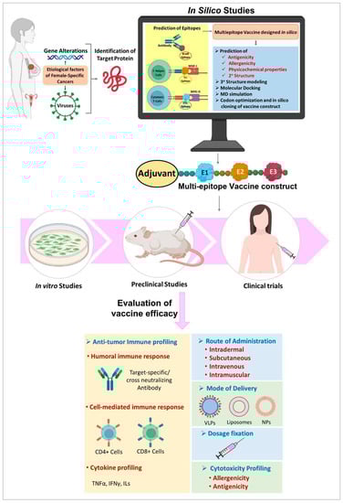 One of the initial steps in the design of a peptide vaccine is the identification of appropriate epitopes with immunogenicity. Immunoinformatics approaches can be effectively used for the prediction of epitopes in vaccine research. The multi-epitope vaccine construct is an acceptable choice for future research [205]. Epitopes can also be designed based on the sequence of TAA or TSA that are encoded by mutated cancer genes [42,206,207]. In the case of viral induced cancers, the viral antigens can serve as a guide for epitope-based vaccine design [208,209,210]. After an epitope is predicted, a multi-epitope vaccine can be designed. Then the allergenicity, antigenicity and physicochemical properties of the vaccine construct is analyzed [211]. It is followed by preclinical or in vitro studies in cell lines and/or in animal models/humanized animal models and various phases of clinical trials before the successful development of a commercial vaccine. A flow chart illustrating a model pipeline for the design and evaluation of peptide vaccine in female-specific cancers is shown in Figure 3.