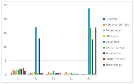 GI50 mean-graph midpoint (MG-MID) a of subpanel cancer cell lines for compounds 2l and 5a–d.