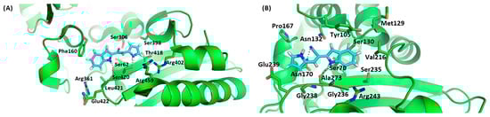 Within PBP4 (Figure 5A), van der Waals interactions were formed between ligand 2x and Ser62, Phe160, Ser306, Arg361, Ser398, Arg402, Thr418, Leu421, Gln422, and Arg459. The indole NH group of the ligand created a hydrogen bond with a length of 1.6 A with the oxygen atom of the carboxyl group from the main chain of Ser420. However, the hydroxyl group present in the side chain of this amino acid residue formed an unfavorable hydrogen donor–donor type interaction with the NH group of the pyrrole ring present within the ligand structure (length of 1.7 A).