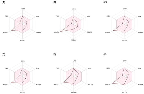 Oral bioavailability radar charts for the studied compounds 2l, 2x, and 5a–d. In bioavailability radar, the pink area represents the optimal range for each physicochemical property of oral bioavailability (LIPO—lipophilicity, SIZE—size, POLAR—polarity, INSOLU—solubility, INSATU—saturation and FLEX—flexibility), while the red lines represent compounds: (A) 2l, (B) 2x, (C) 5a, (D) 5b, (E) 5c, and (F) 5d.