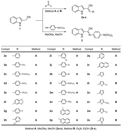 As described in Scheme 1, 2-(1H-indol-2-yl)acrylonitriles 2a–s were prepared upon treatment of a methanolic solution of 2-(1H-indol-2-yl)acetonitrile (1) and aldehydes with sodium methoxide solution at ambient temperature (method A). In turn, 2-(1H-indol-2-yl)-3-acrylonitriles 2t–x were synthesized by reacting acetonitrile 1 with the corresponding aldehydes in ethanol at ambient temperature in the presence of triethylamine as a catalyst (method B).