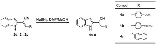 To determine whether readily available compounds lacking the acrylonitrile double bond would retain any activity of the parent compounds 2d, 2l, and 2p, the 2-(1H-indol-2-yl)-3-phenylpropanenitriles 4a–c were synthesized by selective hydrogenation of the olefinic bond using NaBH4 in DMF at ambient temperature, according to Scheme 2.