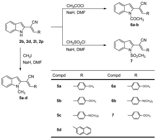 The structures of the newly prepared N-substituted 2-(1H-indol-2-yl)-3-acrylonitriles 5a–d, 6a–b, and 7 were confirmed by elemental analysis and spectroscopic methods (Section 3).