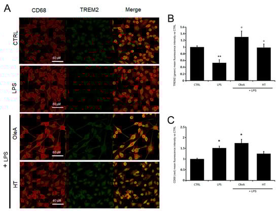 Overall, our data in LPS-exposed cells relative to cell sufferance, ROS production, TREM2 and CD68 expression are in good agreement with each other and indicate that OleA and HT significantly alleviate some of the negative effects of LPS-induced inflammation by reducing TREM2 imbalance while being ineffective where CD68 expression is concerned.