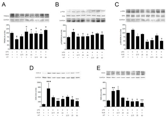 OleA and HT inhibit the pro-inflammatory TREM2-ERK-p38 pathway signaling and reduce the LPS-induced iNOS and COX-2 expression. BV2 cells were starved for 16 h and then treated for 4 h with different concentrations of OleA or HT (12.5, 25, 50 μM). Then, LPS (1.0 μg/mL) was added to the culture media for 24 h. Representative Western blots for TREM2 (A); p-p38 (B); p-ERK1/2 (C); COX-2 (D); iNOS (E) are shown. Signal quantification was obtained by densitometry analysis. Error bars represent the standard errors p-value: *: p < 0.05, **: p < 0.01 ***: p < 0.001 vs. the untreated cells, °: p < 0.05, °°: p < 0.01, vs. the LPS-stimulated cells. Tukey’s test, (n = 3).