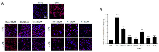 OleA and HT restrain NF-κB activation. (A) Representative confocal images of BV2 cells starved for 16 h, treated for 4 h with OleA or HT (12.5, 25 or 50 μM) and then exposed for 24 h to LPS (1.0 μg/mL) (+LPS). The cells were labelled with primary rabbit anti-pNF-κB antibody and with Alexa 568- conjugated secondary anti-rabbit antibody (red fluorescence). Cell nuclei were labelled with HOECHST dye (blue fluorescence). Scale bar 33 μm. (B) Semi-quantitative analysis of red fluorescence signals vs. untreated cells (CTRL) is shown. The analysis was performed by ImageJ software as the integrated intensity of at least 3 images for each of 3 independent experiments. Statistics: ***: p < 0.001 vs. CTRL; °°: p < 0.01; °°°: p < 0.001 vs. LPS.