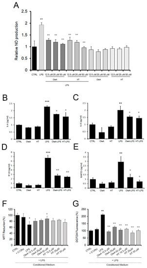 OleA and HT reduce the release of pro-inflammatory citokines and chemokines in LPS-exposed cells. (A) NO release, as assessed in BV2 cells pre-treated with different concentrations of OleA or HT without or with LPS (1.0 μg/mL). The data were reported as mean of triplicate analysis of three independent experiments ± SE. (B–E). The release of cytokines and chemokines was assessed by Bio-Plex analysis of human microglia cells, C13NJ. (F,G) Conditioned medium collected from C13NJ cells exposed to LPS with or without pre-treatment with either polyphenol induced a different cellular response in SH-SY5Y neuronal cells. Mitochondrial function and ROS generation in the latter cells were analysed by the MTT (F) and DCFDA fluorescence (G) assays. In these experiments, SH-SY5Y cells were exposed for 24 h to a conditioned medium obtained from: C13NJ cells (+C13NJ), C13NJ cells exposed for 24 h to LPS (LPS), C13NJ cells pre-treated for 4 h with either polyphenol and then exposed for a further 24 h to LPS. Statistics: *: p < 0.05; **: p < 0.01; ***: p < 0.001 vs. untreated cells (CTRL). °: p < 0.05; °°: p < 0.01; vs. LPS treated.