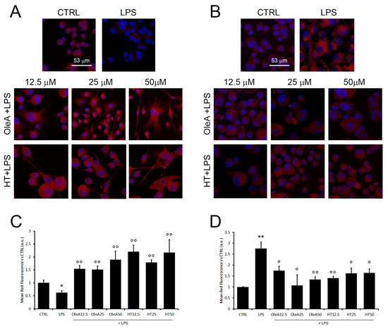 OleA and HT promote microglia polarization towards the M2 phenotype. Representative confocal images of BV2 cells starved for 16 h, treated for 4 h with OleA or HT (12.5, 25 and 50 μM) and then exposed for 24 h to LPS (1.0 μg/mL). The cell membranes were labelled with anti-CD163 (A) and anti-Iba1 (B) rabbit primary antibody and with secondary anti-rabbit-568-(conjugated antibody (red signals). The cells’ nuclei were labelled with HOECHST dye (blue signal). (C,D) Semi-quantitative analysis. Mean values of the mean red fluorescence signals ((C), CD163; (D), Iba1) vs. untreated cells (CTRL). Semi-quantitative analysis was performed by ImageJ software as integrated intensity of at least 3 images for each of 3 independent experiments. Statistics: *: p < 0.05; **: p < 0.01 vs. CTRL; °: p < 0.05; °°: p < 0.01 vs. LPS.
