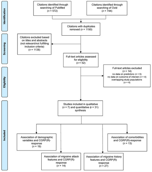 We searched Embase and MEDLINE databases on 16.04.2023 via Ovid and Pubmed using a combination of the search terms: CGRP(-R) mAbs, erenumab, fremanezumab, galcanezumab, or eptinezumab, migraine, predict, response, and responder (see also Supplementary Material S1). Published articles of real-world studies were included if: (a) they included patients with either EM or CM or both, with or without aura who received treatment with CGRP(-R) mAbs for at least three months, (b) the outcome of interest was response to CGRP(-R) mAbs defined as reduction in either MHD or MMD, either in absolute number or proportion reaching a threshold, and (c) if they provided a measure of association between possible predictive factors and response rate. If articles were based on overlapping cohorts, the one reporting more comprehensive data was included.