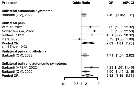 Three studies [42,48,55] found that having unilateral headache predicted a better response to CGRP(-R) mAbs (Figure 5). In Raffaelli et al. [55], super-responders (with ≥75% reduction in MHDs) were more likely to have unilateral pain than non-responders (≤25% reduction in MHDs), although the difference did not reach statistical significance (crude OR: 4.51, 95% CI: 0.72–28.32). Vernieri et al. [48] found unilateral pain more frequent than bilateral pain in the group of 3-month responders, with a significant difference in the mean reduction in MHDs (median of −13 days with interquartile range of 9.5 days in the unilateral vs. median of −5.5 days with interquartile range of 12.5 days in the bilateral group, p = 0.004). Nowaczewska et al. [42] observed that for both unilateral fixed and unilateral alternating pain, the likelihood of responding to CGRP(-R) mAbs was higher, independent of other variables that were also associated with ≥50% response. Ihara et al. reported a nonsignificant univariable OR for unilateral pain and response rate (0.79, 95% CI: 0.33–1.89) [56].