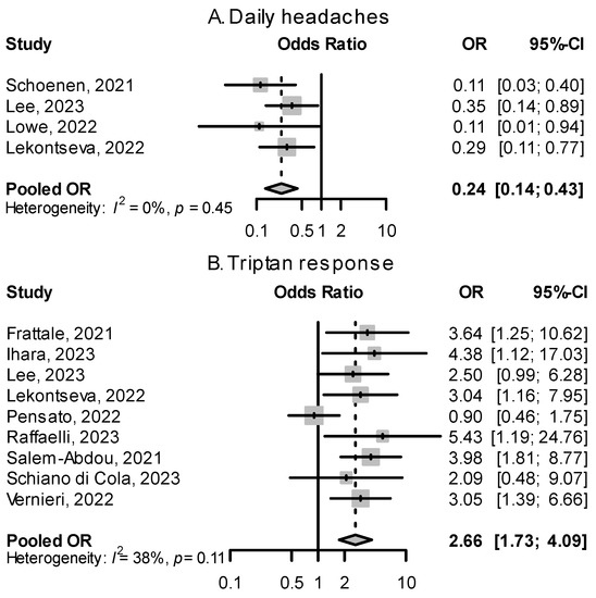 Effects of having daily headaches and being triptan responders on treatment response. (A): ORs for those with daily headaches (continuous chronic migraine) vs. noncontinuous headaches for the outcome of treatment success. (B): ORs for triptan responders vs. triptan non-responders for the outcome of treatment success [52,53,55,56,59,60,61,62,64,66,68].
