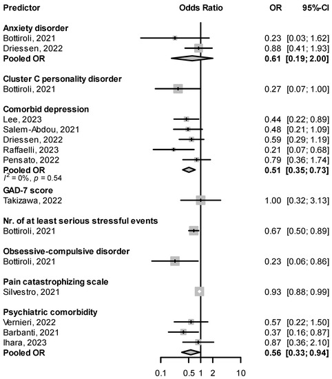 Patients suffering from migraine are about two to five times more likely to suffer from depression or anxiety disorders [80]. In real-life studies of CGRP(-R) mAbs, patients with psychiatric comorbidities in general, and comorbid depression in particular, were less likely to be responders (pooled OR for psychiatric comorbidity: 0.56, 95% CI: 0.33–0.94, for comorbid depression: 0.51, 95% CI: 0.35–0.73, Figure 9). Associations were also seen between response failure and traits imbuing psychological vulnerability, such as personality disorders and the number of serious stressful events [45] (Figure 9). Lovati et al. [46] found non-responders (<30% reduction in MHD) scored higher on disinhibition, anhedonia, depressivity, and distractibility on the Personality Inventory for DSM-5 (PID-5) questionnaire than full-responders (>50% reduction in MHD) [46]. In Driessen et al., however, the response rate to fremanezumab was not significantly different in subgroups with major depressive disorder or generalized anxiety disorder [47].