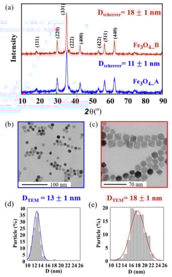 The thermal decomposition of iron(III) oleate in a mixture of 1-octadecece, dibenzyl ether, and oleic acid yielded iron oxide NPs of 13 nm (Fe3O4_A sample) and 18 nm (Fe3O4_B sample) (Table 1). A mixture of ODE and DBE organic solvents was used to avoid the appearance of the metastable wüstite phase in the prepared NPs and to induce different growing behaviours [31].