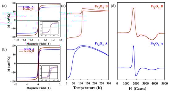 The effects of the size and shape of the magnetite NPs on their magnetic behaviour were analysed by means of magnetisation measurements versus magnetic field, M(H), and temperature, M(T), as variables. In Figure 2a, hysteresis loops at room temperature are presented, where the magnetisation reaches values close to saturation at moderately low fields (<5 kOe), in good accord with the ferrimagnetic character of magnetite. The saturation magnetisation (Ms) of the samples Fe3O4_A and Fe3O4_B at 300 K are 78 Am2 kg−1 and 92 Am2 kg−1 (referring to the mass of Fe3O4), respectively (Table 2). These values have been normalised per unit mass of the Fe3O4 cores, which were calculated via thermogravimetry by subtracting the organic content from the total particles mass. The saturation value of sample Fe3O4_B, close to the magnetic saturation of bulk magnetite, is indicative of the high purity and crystallinity of the Fe3O4 phase obtained by controlling the thermal decomposition process, as was already deduced from the TEM measurements [39]. The lower values of saturation in sample Fe3O4_A can be ascribed to surface-volume effects, which are more pronounced in smaller-sized NPs. The large proportion of atoms on the nanoparticle surface could cause reduced ferrimagnetic coordination, inducing surface magnetic frustration and reduced electron mobility [40,41].