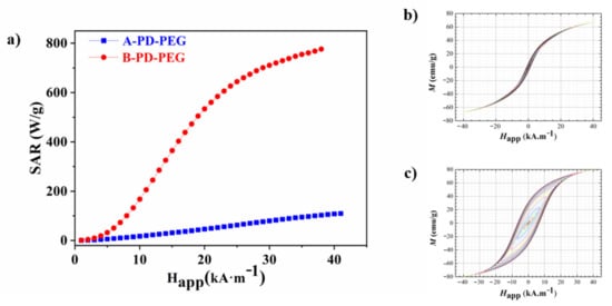where is the time-dependent dynamic magnetisation (normalised by NP mass) and is the externally applied magnetic field intensity. The experimental SAR values versus the applied magnetic field of the Fe3O4_A@PD-PEG and Fe3O4_B@PD-PEG samples are represented in Figure 4. The AC magnetic field frequency applied was 311 kHz whereas the intensity of the magnetic field was increased to 40 kA/m.