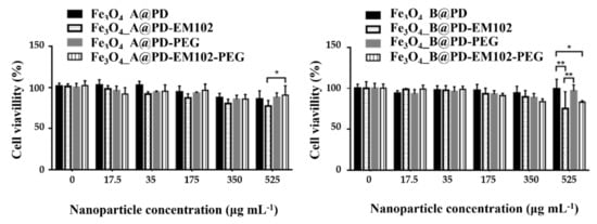 Cytotoxicity experiments for the Fe3O4_A and Fe3O4_B samples functionalised with PD, PD-EM102, PD-PEG%, and PD-EM102-PEG% copolymers at different concentrations of the nanosystems in HTC 116 cells. * and ** pair of samples with significant improvement in toxicity.