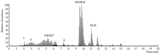 Total ion chromatogram of the grape marc extract. See the code correspondence in Figure 2.