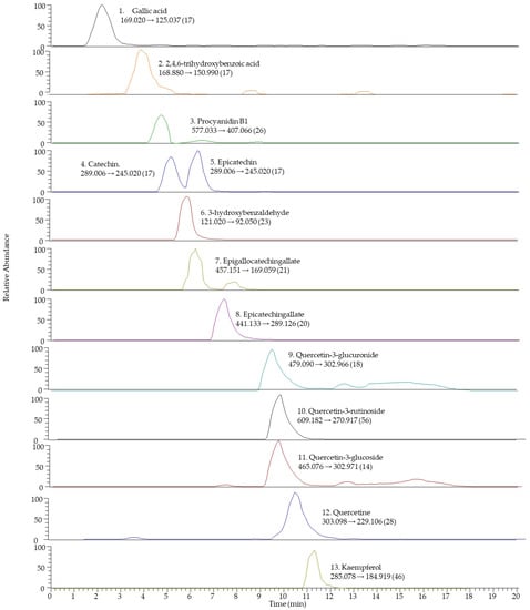 SRM-reconstructed chromatograms for the 13 target polyphenols detected in the white grape marc extract.