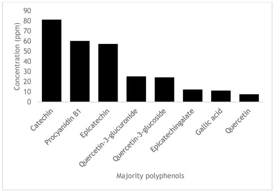 The most abundant polyphenols detected in our extract were coincident with the ones reported by other authors that evaluated the antibacterial activity of white grape marc extracts (Álvarez-Casas et al. [31], Rodríguez-Rama et al. [33], Pop et al. [51] and Trošt et al. [44]). In all cases, the predominant ones were flavonoids of the flavan-3-oles family, with catechin and epicatechin being the most abundant. There are, nevertheless, big differences in the nature of minority polyphenols. Different variables (part of the grape studied, variety, weather, geographical factors, vineyard, harvest year, production techniques), as well as polyphenolic extraction techniques and analytical detection methods used, may be responsible for this variation [19,30,46,52,53].