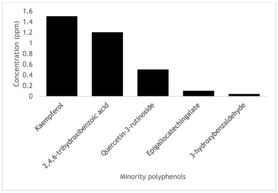 Detected polyphenols in the Albariño white grape marc extract and their concentration in ppm (m/v), categorized as majority and minority fractions.