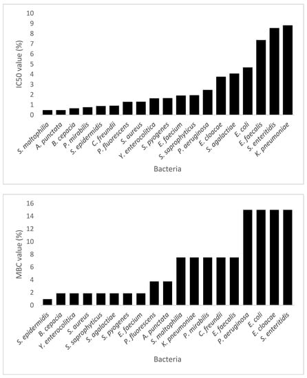 The antibacterial activity of the extract against the tested bacteria was assessed by calculating the minimum bactericidal concentration (MBC, i.e., the lowest concentration of an antimicrobial agent capable of removing 99.9% of an organism in vitro) [29] and half the maximum inhibitory concentration (IC50, i.e., the concentration of an antimicrobial agent capable of reducing the bacterial concentration to 50% of the initial concentration).