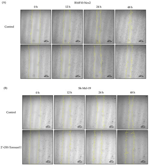 To evaluate the effect of the compound on melanoma cell migration, the assay was performed according to Justus et al. [67], with minor modifications. For this purpose, the cells Sk-Mel-19, Sk-Mel-28, Sk-Mel-103 (5 × 104) and B16F10-Nex2 (4 × 104) were plated in 24-well plates and incubated in a CO2 oven at 37 °C. After reaching 90% confluence, a vertical scratch was made in the middle of each well with a 200 µL sterile tip. Then, each well was washed with 500 µL of 1× PBS to remove detached cells, and subsequently, the cells were incubated in a culture medium containing 1% SFB with 2′-OH-Torosaol I, diluted in 0.2% DMSO. Each well was photographed in three distinct regions with an inverted phase-contrast microscope (Olympus CKX41; 40× magnification) at the times of 0 h, 12 h, 24 h, and 48 h. To calculate the migration rate, the areas were determined at each time using ImageJ Software (NIII, Bethesda, MD, USA). Three independent experiments were performed in triplicates. For migration calculation, the following formula was used: