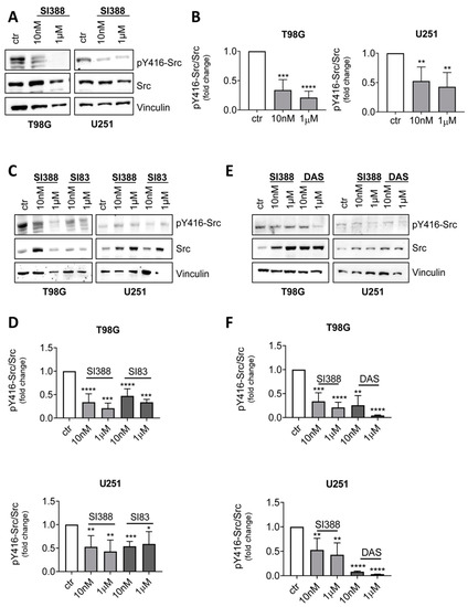 To test the ability of compound 2a (SI388) to inhibit Src activity in vitro, we took advantage of glioblastoma cellular models. Glioblastoma, indeed, was the first cancer type to be systematically studied by The Cancer Genome Atlas Research Network (TCGA)[17], who identified the RTK/Ras/PI3K pathway as having the most frequently deregulated signaling [4,18], with Src being a common node downstream of different RTKs [4,10].