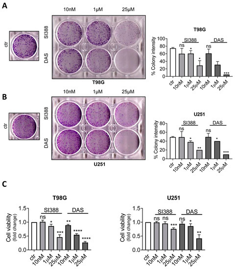 To further characterize the ability of SI388 to inhibit tumor growth, we performed clonogenic assays using T98G and U251 cell lines. Cells were starved and treated for 24 h with increasing concentration (10 nM, 1 µM, and 25 µM) of SI388 or DAS. The ability of single cells to proliferate and produce colonies was evaluated after 15 days, both in control conditions (treated with DMSO) and after treatment with different Src inhibitors. As shown in Figure 3 (panels A and B), both SI388 and DAS impaired cell growth and proliferation in a dose-dependent manner in both cell lines.
